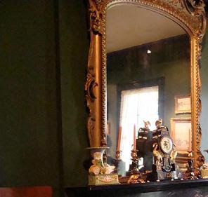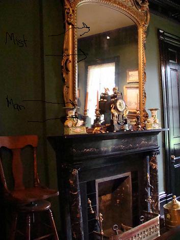 Futhermore, if you go back and look at the full image you can see that in order to cast that type of reflection the man would need to be standing directly in front of the fireplace with his back to the mirror. I emailed this image to Kevin Kelly, who told me he was quite perplexed as he does not believe in ghosts. He confirmed two important things. Firstly, there is NO smudge on that mirror. So, that misty image is something that was in the process of manifesting as my camera took the picture (I have a Sony CyberShot digital camera & had it set for auto-exposure so my flash would not go off). Also, he pointed out that in order for the man’s reflection to appear as it does in the mirror he would have to have been standing inbetween the fireplace and the billiards table. He had his staff attempt to duplicate this reflection and there is nowhere else in the room one can stand in order to cast that type of reflection in the lower left-hand corner of the mirror, except right in front of it. Mr. Kelly was also the one to point out to me the figure in the mirror is transparent.