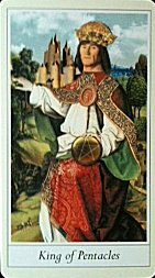 “The King of Pentacles represents a sensual, steadfast individual. He is often quietly successful, but disinclined to promote himself. This king sometimes denotes a wealthy man who owns property & has made prudent investments. His love of tradition, elegance & quality pervades everything in his life. His feelings are deep & enduring, & his love is not easily won. He is loyal to his partner & surprisingly sensual. Possessiveness can be a problem stemming from his profound need for security in all things. You may need to reassure him frequently, but once he trusts you he will relax.”