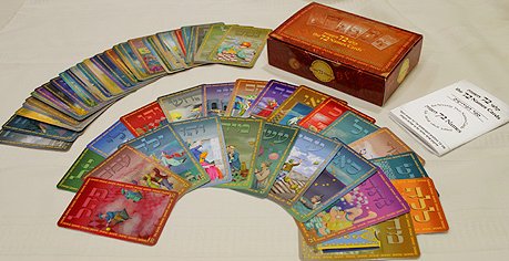 The guidebook is only slightly larger than that cards. It has a simple fold-over stapled binding and is 71 pages long. The cards are listed by their number, which appears in the lower left-hand corner of each card. Both the cards and the guidebook are housed within a recessed well inside a laminated cardboard box. The box closure consists of a hinged lid with a flap that fits into a slit along the front side of the box.