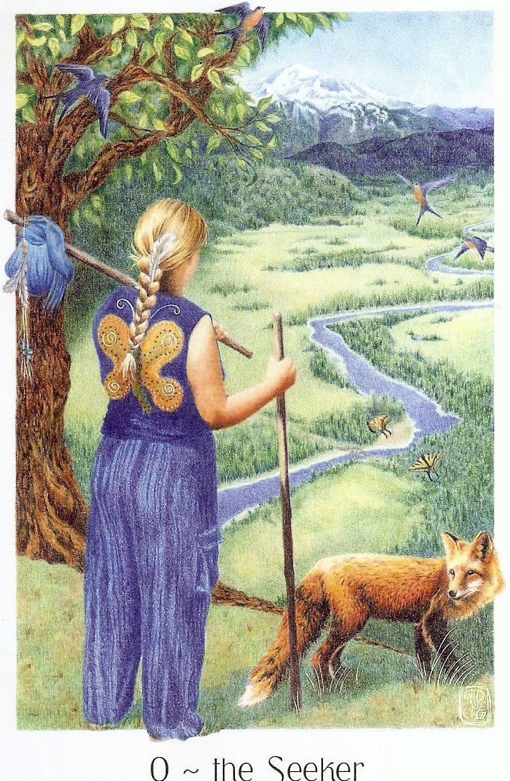 The Seeker is known as The Fool in most tarot decks. Here The Seeker stands on the crest of a hill overlooking a lush valley. Instead of the usual little white dog there is a fox with her that seems to be guiding her footsteps. The Seeker appears to be at the start of a marvelous journey that will take her to new places and exp…ose her to new experiences.