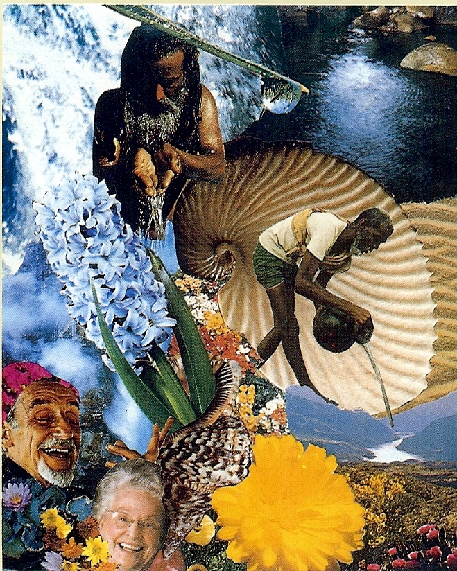 For today’s draw I am focused on the man on the right-hand side of the card who is pouring water from a vase. The manner in which the collage was done (and folks, this deck was created way back in the day before Photoshop so all these cards were collaged by hand with scissors & glue!) this man appears to be much larger than the mountains and river below him. Is he a god? I don’t know, but I have always felt he represents some form of a higher power. The water he pours appears to land higher up in the mountain range and may actually be the source of the river. The water represents healing energy and the man is sending this to the earth’s waters so that the healing energy can permeate the entire earth and affect every single living thing, for every life-form on our planet needs water in order to survive.