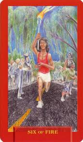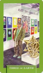 Scenes of everyday life to which we can all relate are included. For example, featured on the box is the 9 of Air (fears, worries, nightmares). This is a depiction of a woman seated at her kitchen table. Her head is thrown back with a look of worry on her face. Her check book pen, and 9 bills rest on the table in front of her. She is clearly overwhelmed. Most of us can completely relate to how she feels. Death, a bridge we must all cross at some point, is illustrated as a bridge (also depicted on the box lid). Another common experience most of us have had at one time or another either in person or on TV we’ve seen a runner proudly carrying the Olympic torch. The 6 of Fire (victory, success) depicts this image. On the 3 of Earth, a card of creativity, we see a man admiring the paintings in an art gallery. Once again, this is an activity in which many of us have participated at one time or another. The artist, Christopher Wilky, included a self-portrait of himself as the man on this card, which I thought was a very nice personal touch. Suits are named for the elements that they represent. Wands are Fire, Swords are Air, Cups are Water, and Pentacles are Earth. The court cards are renamed Child (Page), Youth (Knight), Mother (Queen), and Father (King) to reflect the modern nuclear family. Aces in “Today’s Journey Tarot” are called Ones.