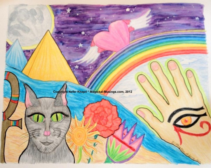 This one is for Caitlyn, G. When I create a Soul Portrait all I have to go on is the person’s name, date of birth and current location. I never ask for any additional information because it’s simply not required. The images that come through often have to do with past life influences and they also very often give major clues as to what a person’s life purpose is this time around. Here, you can obviously see that Caitlyn has a very strong Egyptian past life influence, actually several. Each Egyptian image: the Ankh on the far left, the 2 pyramids, the cat, and the Eye of Horus on the back of the hand on the far right, all indicate a separate Egyptian past life.