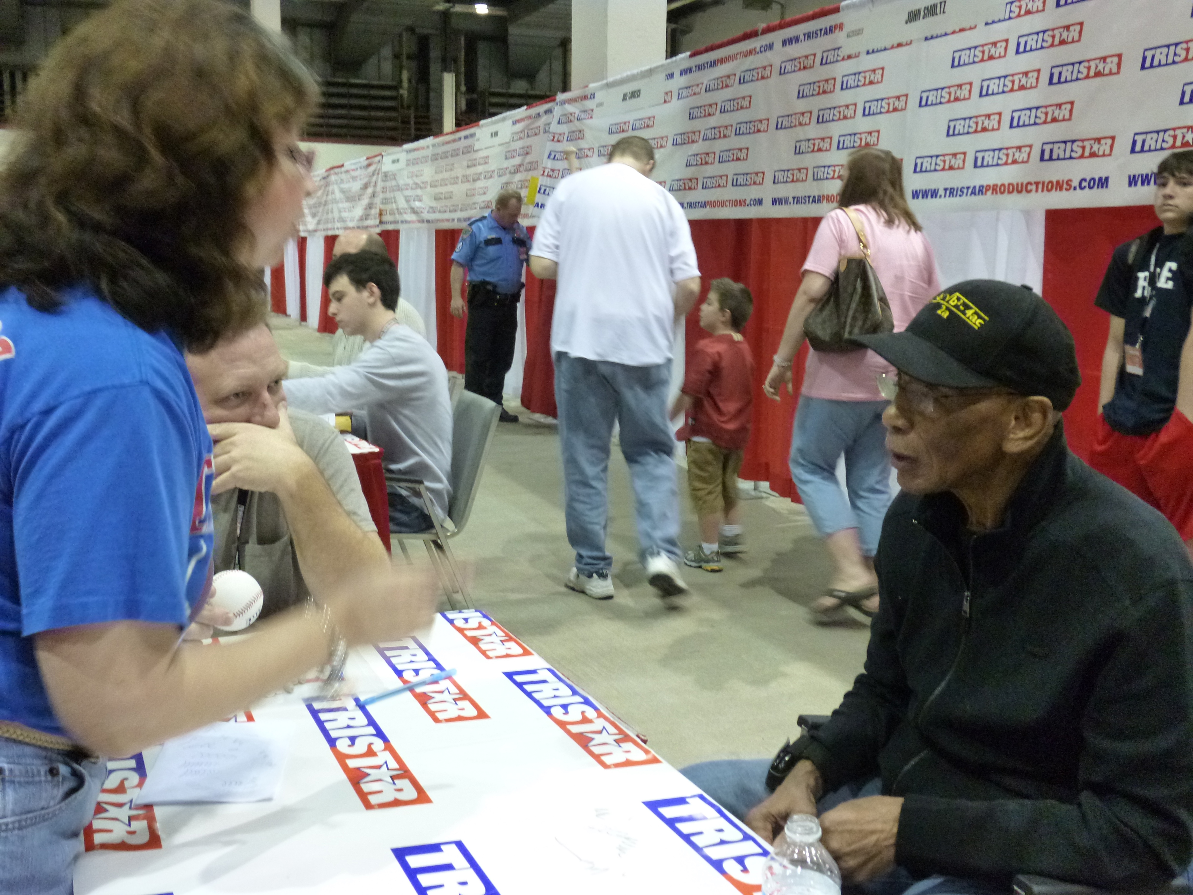 fog of disbelief as I kept asking myself, “did that just happen? Did I really just meet and talk with Ernie Banks??” I also got to meet former Cubs pitcher Ferguson Jenkins, or Fergie, as he is affectionately known. He was nice, but not nearly as friendly as Ernie. He also let me pose with him for a picture. They’re not supposed to do that at the autograph tables. You have to pay separately for photographs and autographs at these events. Pictures are done prior to the autograph sessions, but both of them posed with me & someone who was with Fergie also took pictures of me with him. I guess because of my t-shirt, which is a whole OTHER story.