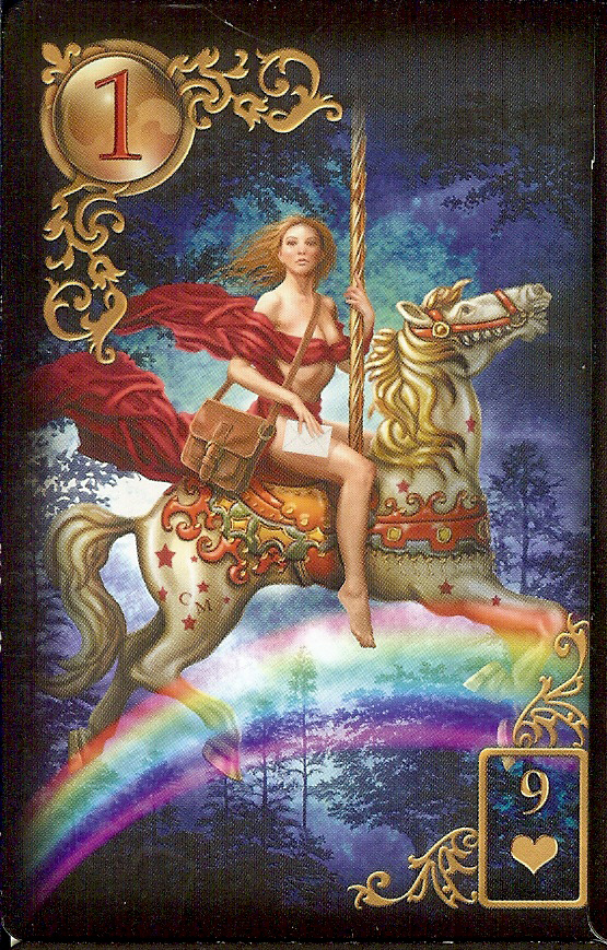 Now, if you are a die-hard traditional Lenormand reader you may not appreciate The Gilded Reverie Lenormand because liberties were taken with the imagery. This deck is the result of Ciro’s own unique artistic interpretation of the Lenormand. Hence, the Rider is not male, but female and doesn’t ride a flesh-and-blood horse, but is upon a carousel horse. Paths/Crossroads is translated into stairways, and the imagery overall is fantastical and the cards are loaded with imagery, which is a removal from the traditional single symbol on a blank or very plain nondescript background approach that the vast majority of earlier decks have used and are now seen by many as traditional Lenormand. If you only want the symbol itself with a blank background, perhaps muted colors, and an old-timey look and feel to your Lenormand deck, then The Gilded Reverie Lenormand is NOT the deck for you. I just want to make this clear so that no one who reads this review then purchases the deck upon my recommendation comes away exclaiming, “this is not Lenormand!” Well, it is, but it’s Ciro’s Lenormand, and in my book that makes it very, very special.