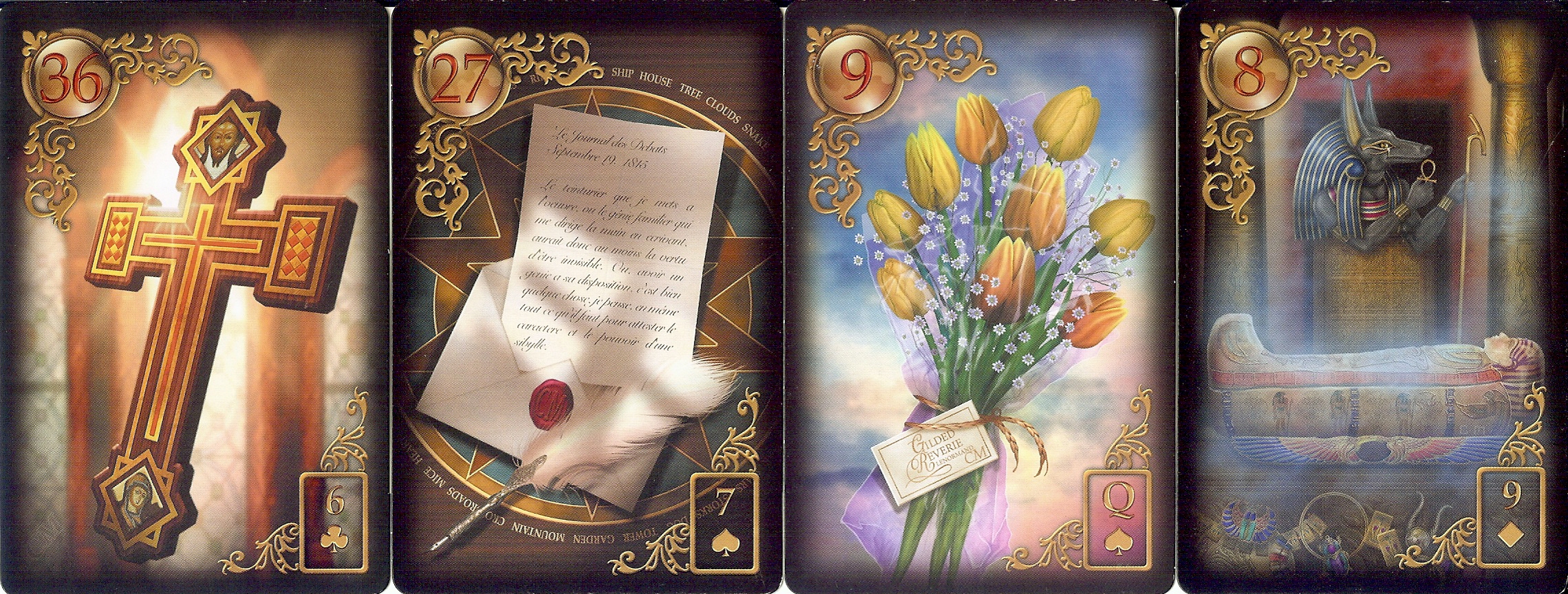 Yet another unique feature of this deck is that it is highly unlikely (though cannot be absolutely guaranteed) that my deck, as well as everyone else’s deck, is unique among all the other copies of The Gilded Reverie Lenormand. The self-publishing option was chosen because it gave the artist more creative freedom. Ciro chose to depict several of the cards in various color schemes. The Ring, for example, is done with a red, green, or blue jewel. I have also heard the roof on the house is different colors. The book on The Book card depicted in the free PDF download on Ciro’s site is brown. The book in my deck is a burnt umber or light black color. For the Bouquet card the tulips in the PDF are red and are wrapped in purple tissue. The tulips on my copy of the Bouquet card are yellow, wrapped in a pale lavender tissue. My deck differs from the deck in the PDF file on the following cards: Ship (red emblem on the sale in the PDF, green emblem on my card), Birds (PDF version: red roof & red diamond pattern on walls of the bird house; the version I own: green roof & blue diamond pattern on the walls of the bird house), Sun (PDF version has a red background while the background on my card is blue), and there are also differences on the Moon, Fish (the fish on my card swim in opposite directions to the Fish on the card depicted in the PDF & they are rainbow colored whereas the PDF fish are red & purple), Owls, Bridge, Dice, and especially the Mask in my deck are all different from those depicted in the PDF. I have no idea how many color combinations Ciro used for these particular cards, but on his website he states there is a 1 in 8,000 mathematical probability of any two people having the same exact colored deck. I find the uniqueness factor of this deck to be one of its most fascinating qualities.