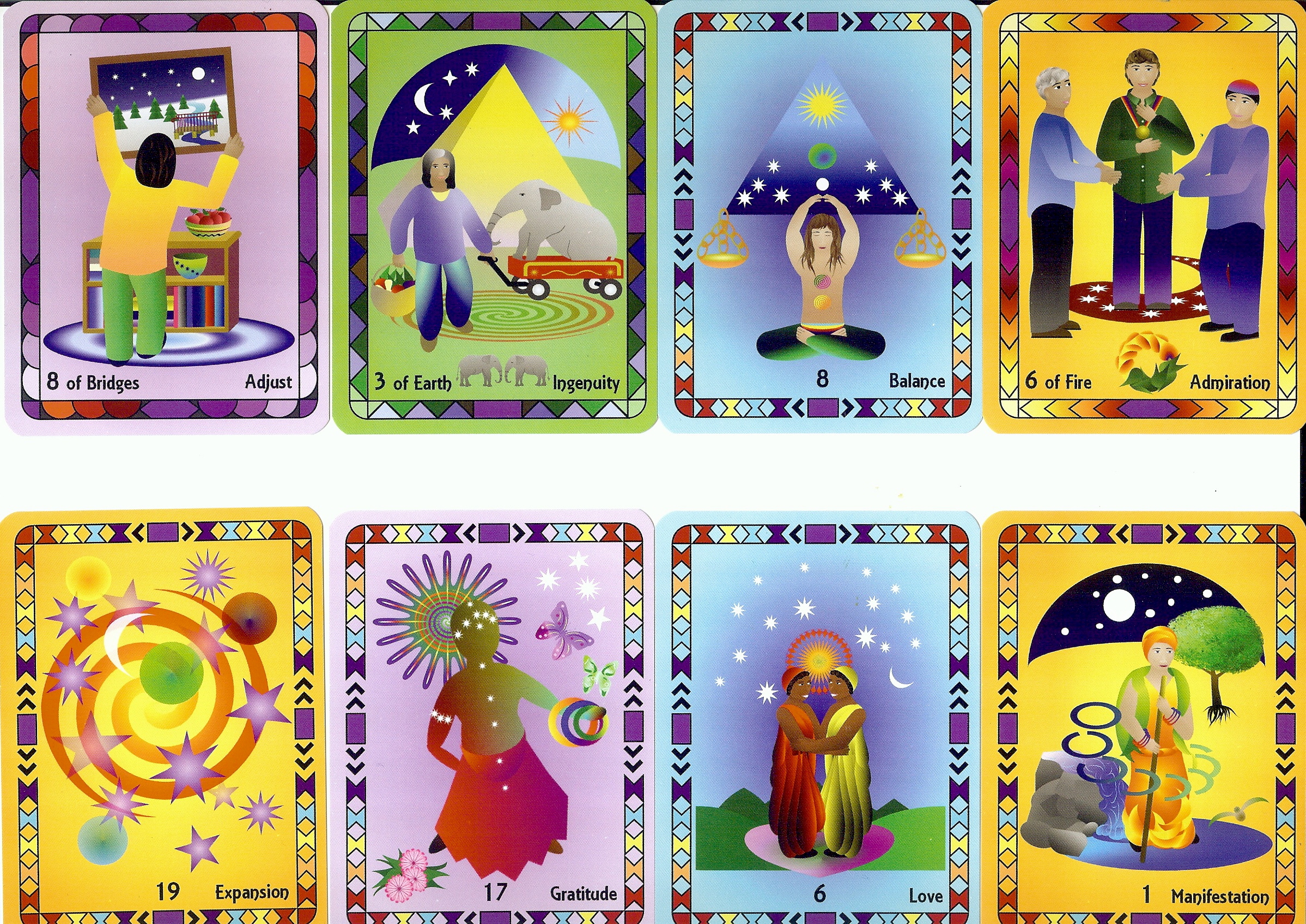 Usually, when a deck creator decides to include a fifth suit it will correspond to the Element of Spirit, or Ether, recognized as a fifth Element in addition to Air, Fire, Water and Earth. However, The Radiant Spirit Tarot is unique in that the deck creator chose to focus on the process of creation and manifestation of ideas into physical end results, thus her suit of Bridges embodies the energies of the process of creation and manifestation. In The Radiant Wisdom Tarot the suit of Bridges represents the process of creativity from initial idea or desire to the final physical product. Thus, The Radiant Wisdom Tarot is a useful deck for artists and writers who wish to consult the tarot about their projects. I have done so with this deck; and again, I was given some very clear and helpful insights to my creative process.
