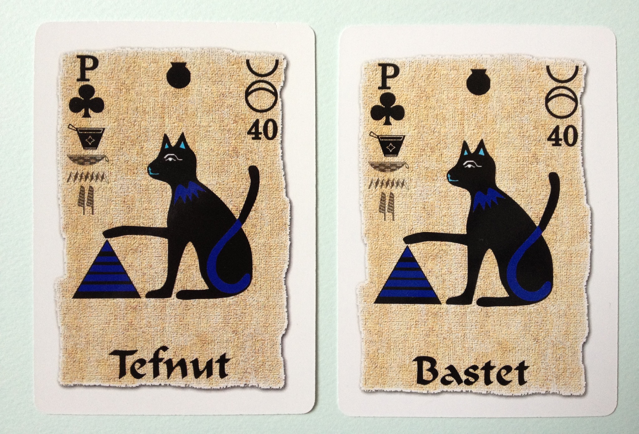 Housed in a sturdy 2-part lidded plastic box reserved for the highest grade of playing cards, The Egypt Cards have 56 cards, plus 1 extra, which is a Bastet card that was originally mislabeled. Card number 40, the Page of Clubs/Cups should be Bastet, the cat goddess of ancient Egypt, but originally this card was mislabeled Tefnut. Both cards are included in each set. This just goes to show everyone what a little trickster Bastet is. She enjoys playing little jokes on us.