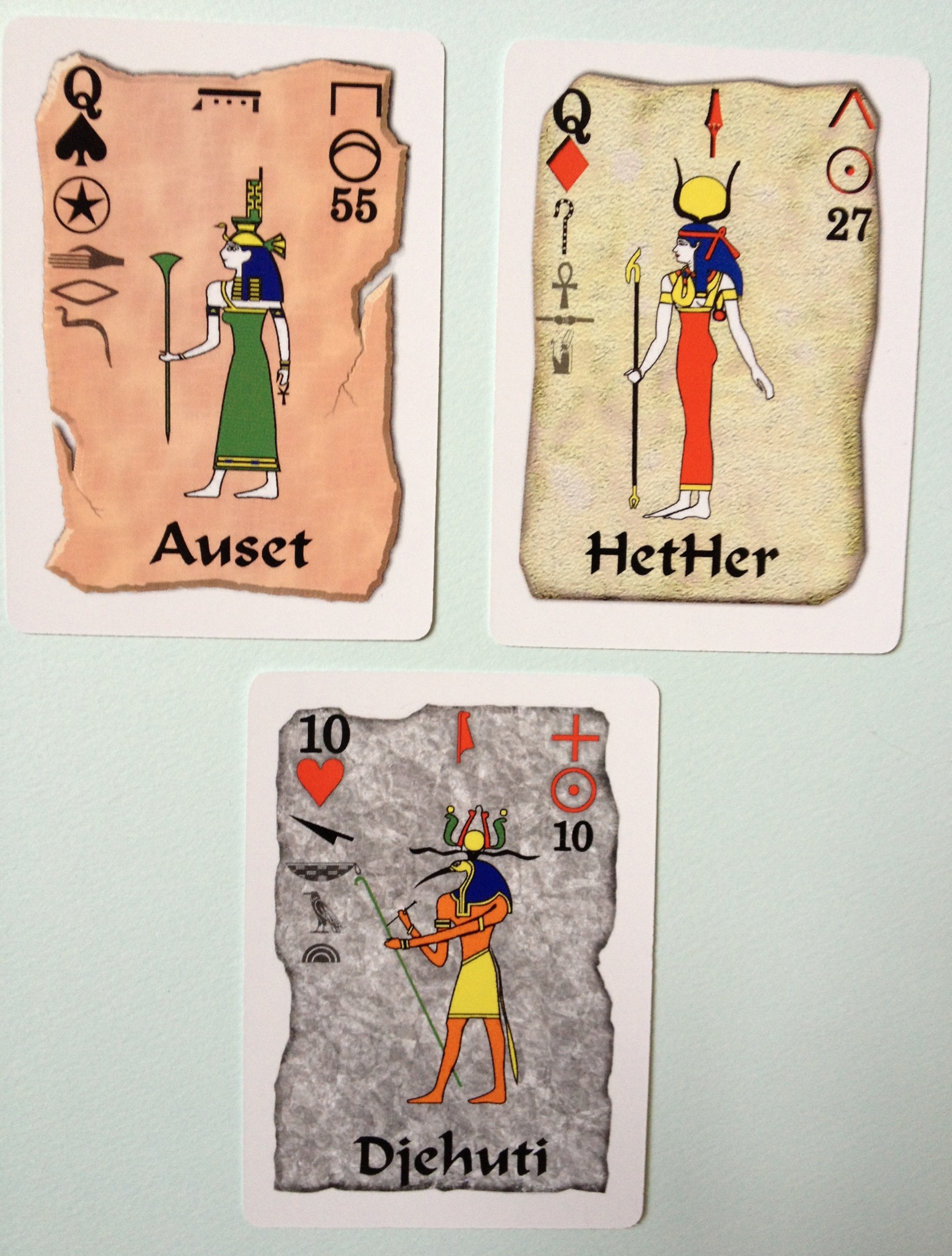 The cards are sized exactly like regular playing cards 2 ½ X 3 ½”) with the same type of laminate surface. They are supple and extremely easy to shuffle, even by those of us with small hands. Card backs consist of a glyphic design within a colorful border done in the traditional colors of ancient Egypt. Card backs are fully reversible since the two rows of glyphs are mirror images of one another. Around the colorful border there is a ¼” white border, which is also present on card fronts.