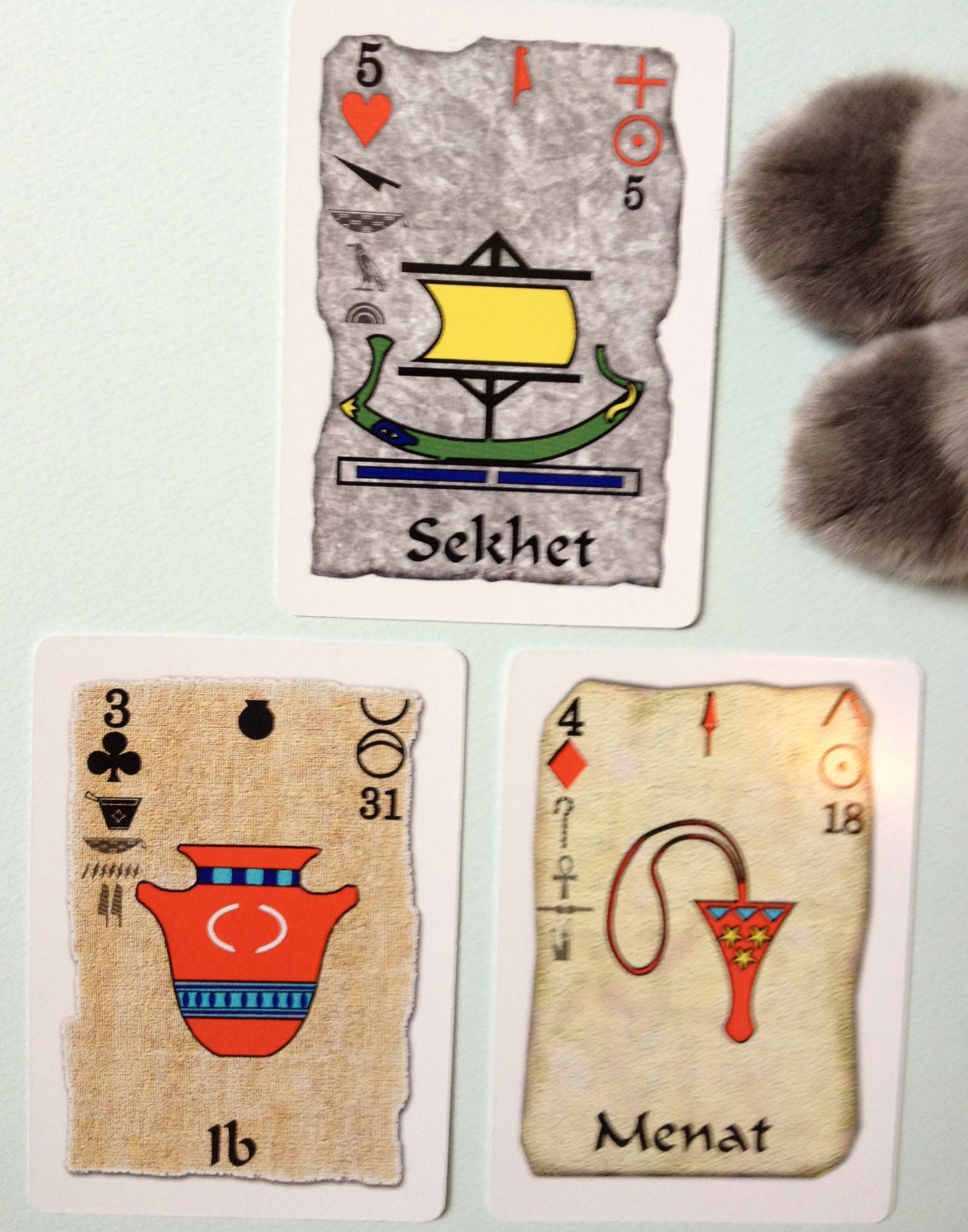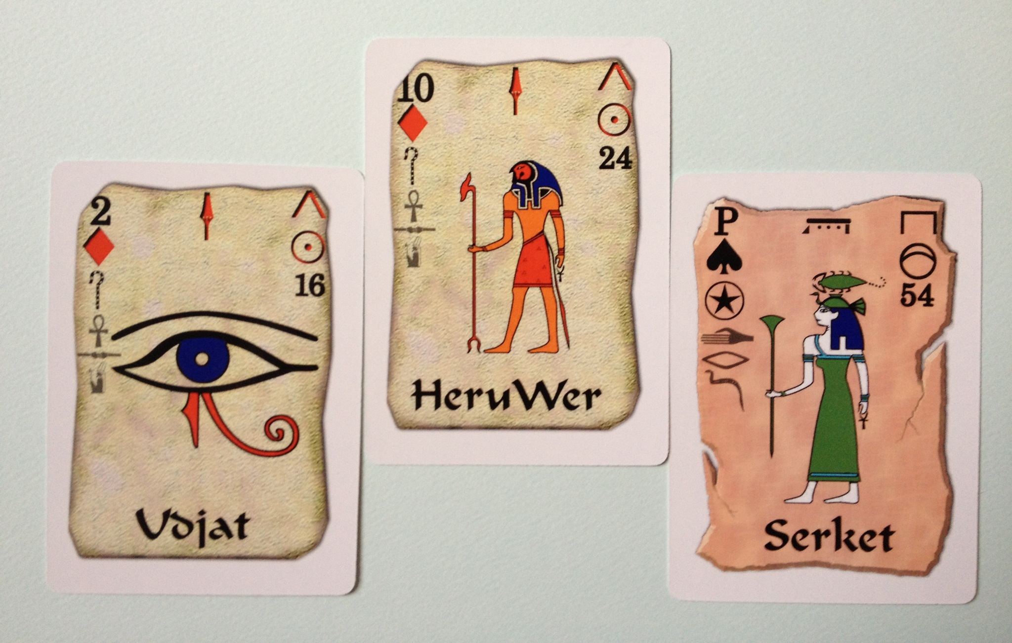 Udjat corresponds to the 2 of Diamonds and the Tarot suit of Wands, so also the 2 of Wands, by association. The symbol on the card is the Eye of Horus, a strong amulet of protection. According to the guide book, Udjat represents physical as well as spiritual vision. It speaks of meditation, use of the third eye, and of following one’s intuition.