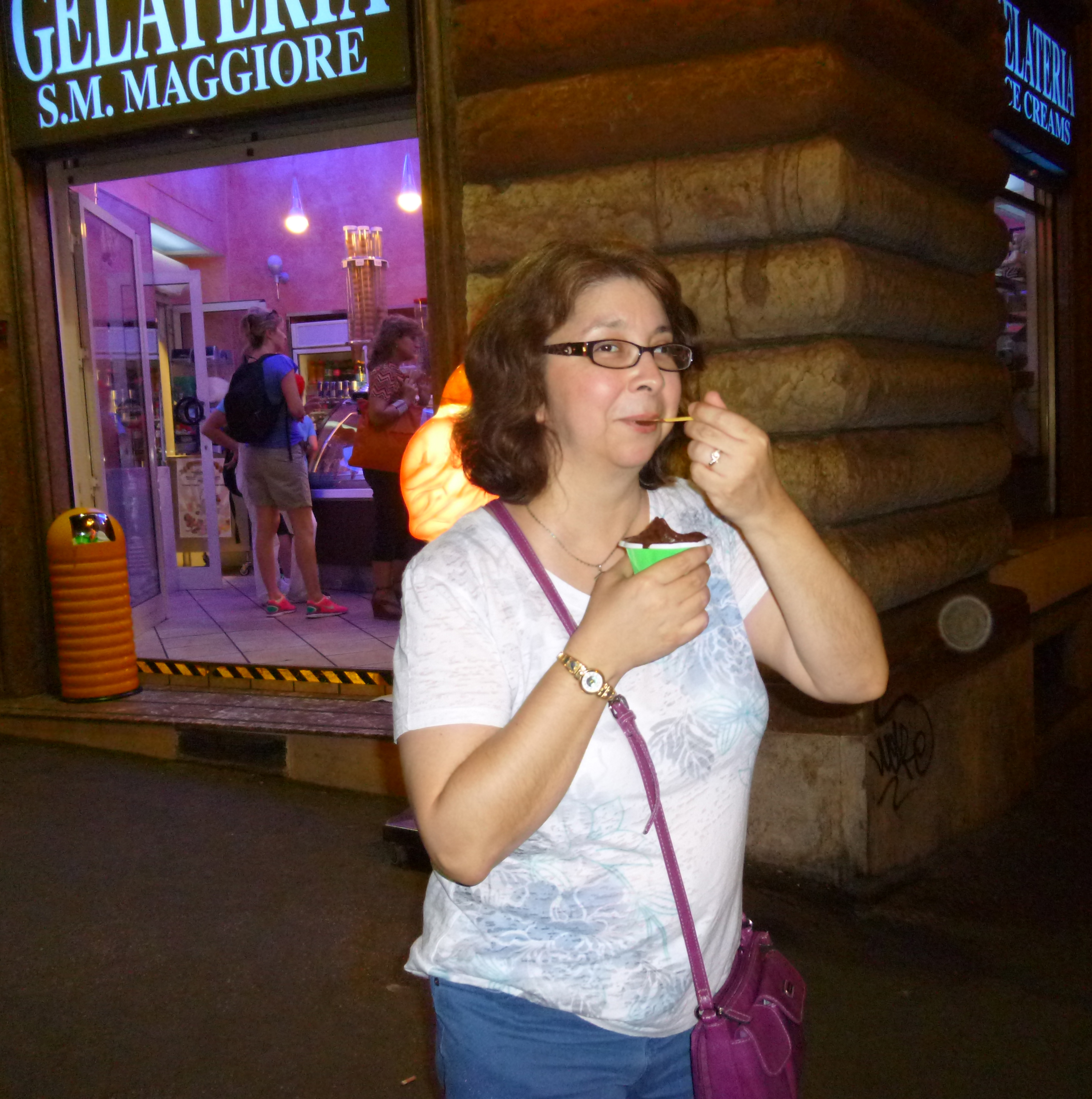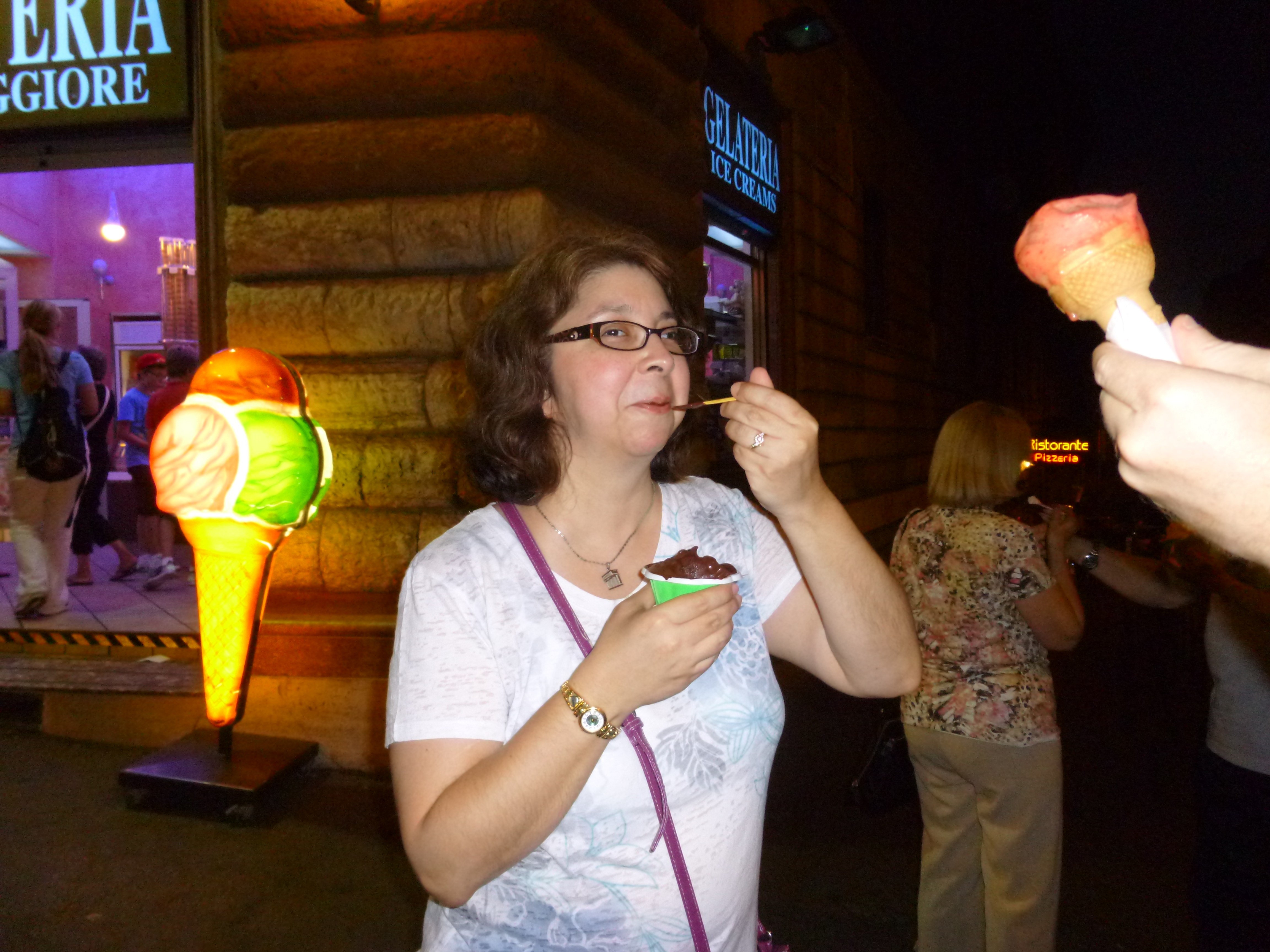 Here is an example of an orb that showed up in picture my daughter took of me June 26, 2012 when we were in Rome. This was also the day I received the total healing of my 39 chronic knee problem from the Virgin Mary in Her basilica, which is actually about 2 blocks away from this gelato place that was down the street from our hotel. Note my left elbow & the fact that in this first picture there is nothing there, just me enjoying fudge gelato. BTW, the owner on the 2nd night had won Best Gelato in Rome & came while we were there with his huge trophy and did a dance, so little did we know we were eating the best. All I knew was that it was to die for.