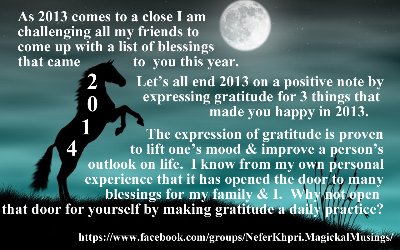 Instead, I recommend looking back on all the GOOD that occurred. It could be anything from something as basic as having a roof over your head & food on the table everyday to perhaps a special new friendship that began, a gift someone gave you, or the happiness you felt when you gave a gift to someone special. Think on those things and then begin to create your list of things for which you are grateful that came to you in 2013.
