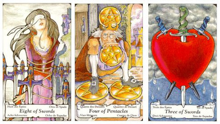 If you’re relatively new to Tarot I would recommend that you begin with a deck for which all the pips are fully illustrated with scenes. The pips are the minor arcana – the four suits (Wands, Cups, Swords & Pentacles) and their cards, Ace – King. Some decks only represent the pips numerically. For instance, the 2 of Cups will be just that, a picture of 2 cups. The 6 of Pentacles will be simply a picture of six pentacles, and so on. When the pips are fully illustrated the cards are depicted scenically.