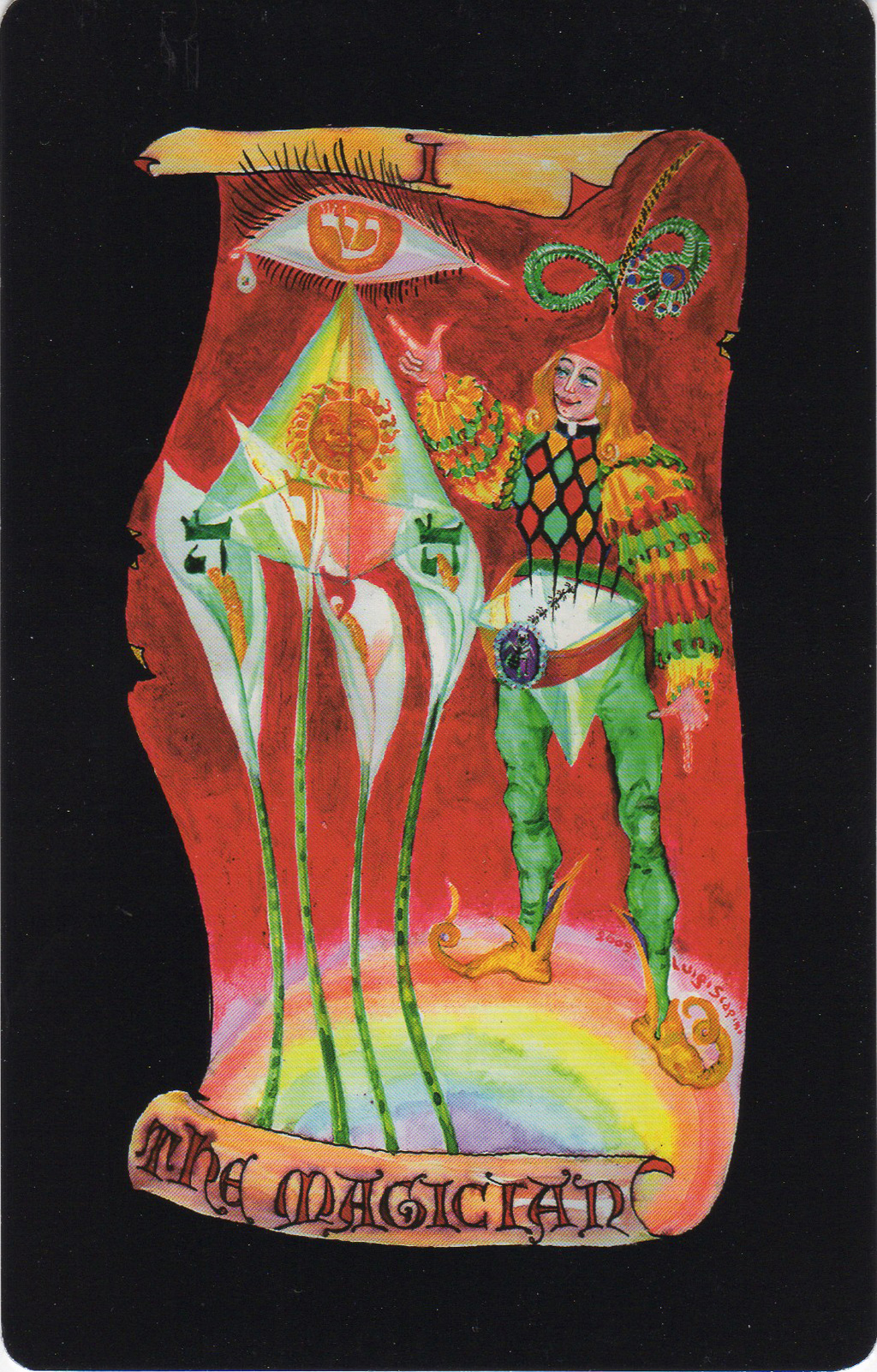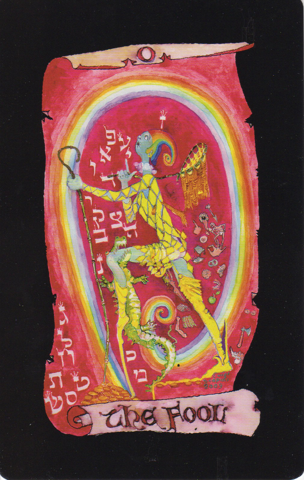 Scapini’s visions are surreal. The little white dog of the RWS Fool card has been replaced by a baby crocodile that chomps on the Fool’s left leg. The Magician appears in his traditional “as above, so below” pose,