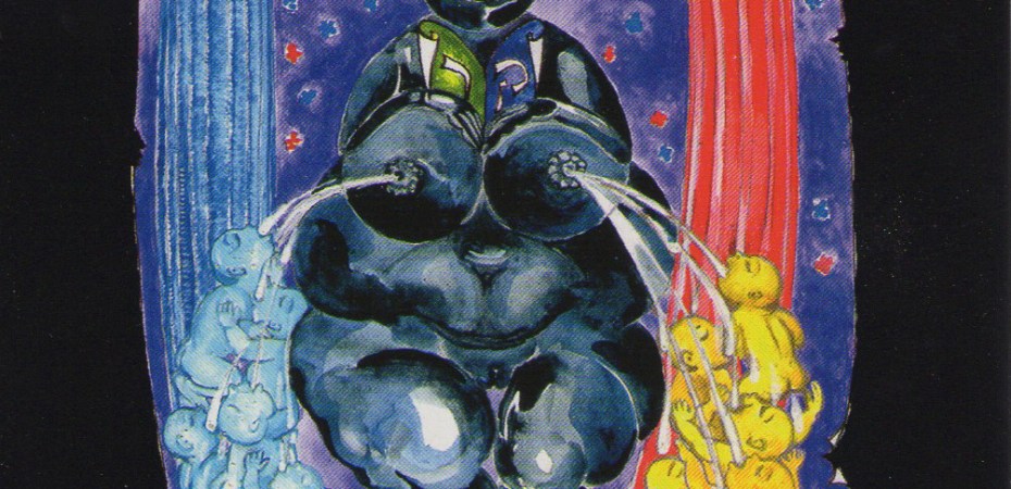 but he points to a disembodied eye above a sun within a prism surrounded by four calla lilies. The Popess (aka High Priestess) is the famous Venus of Willendorf figure that dates to the Upper Paleolithic (28,000 – 25,000 BCE). She is depicted in black and spews milk from both nipples as she feeds her many blue and yellow babies to either side of her while two green primate-type creatures with erect phalluses face one another along the base of the image.