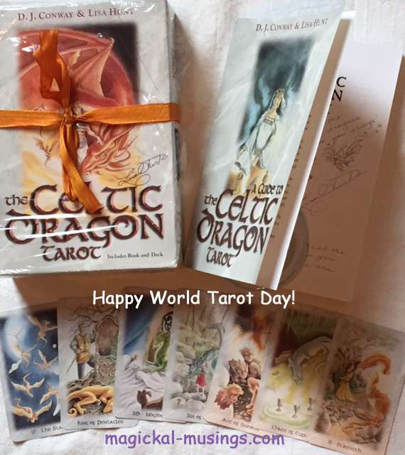Every World Tarot Day I celebrate by giving myself a lengthy Tarot reading using my all-time favorite deck, The Celtic Dragon Tarot, by Lisa Hunt (Llewellyn Publishing, 1999). I have 4 copies & this one pictured is my pride & joy because the box & book were both signed by Lisa. This is the deck that inspired me to become a deck creator myself & now my Egyptian Lenormand deck is available at Amazon & other booksellers.